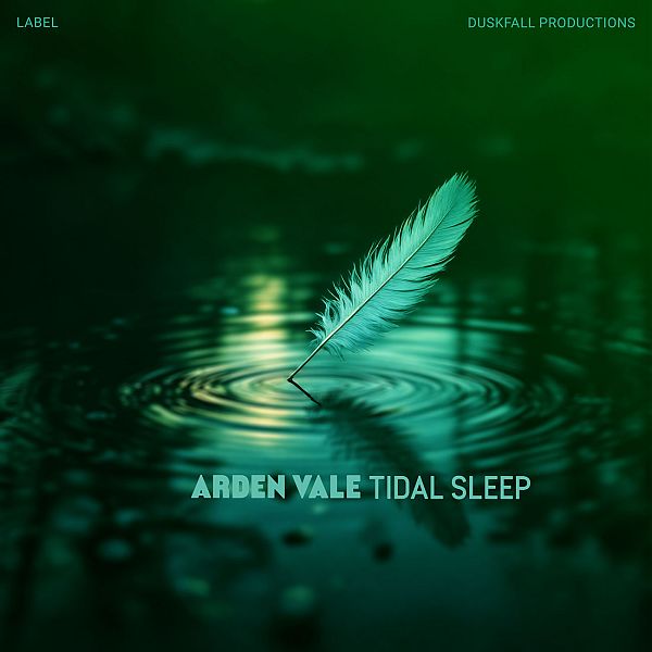 “A green feather floats on rippling water, surrounded by a deep green background.”