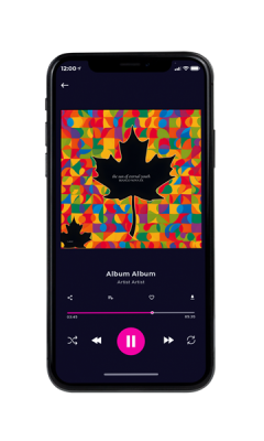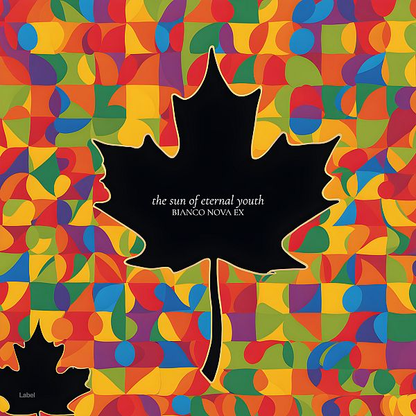 “A black maple leaf silhouette on a vibrant, multicolored geometric background.”
