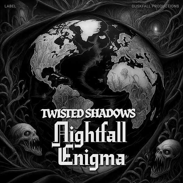 “A dark, intricate illustration of a globe surrounded by shadowy vines and skulls, creating a mysterious and eerie atmosphere.”