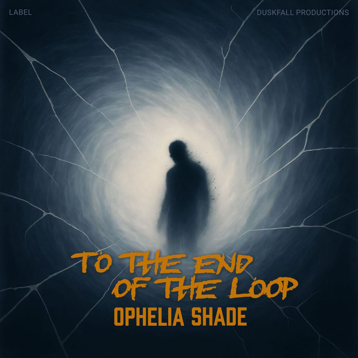 “A silhouette stands in a glowing tunnel surrounded by web-like cracks, creating a mysterious and dramatic atmosphere.”