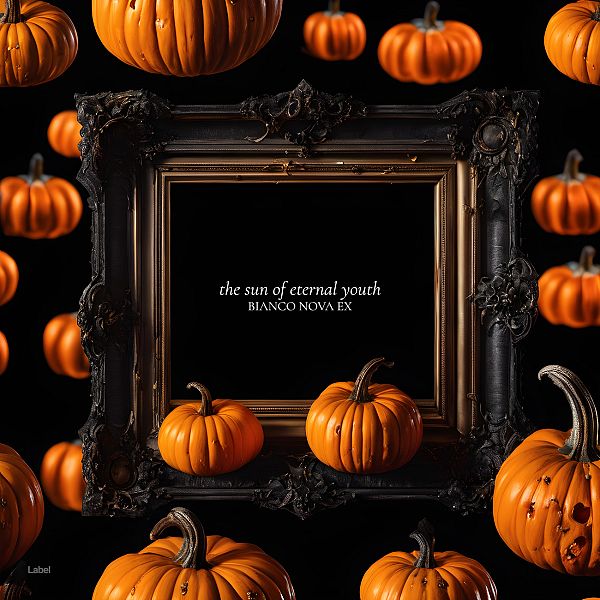 “Ornate empty frame surrounded by floating pumpkins on a black background.”