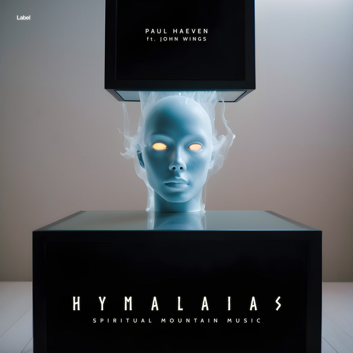 “Futuristic blue head with glowing eyes, emerging from dark boxes. Ethereal and surreal theme.”