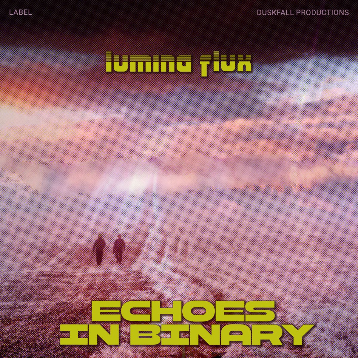 “Two figures walk on a misty, surreal landscape with a vibrant, colorful sky.”