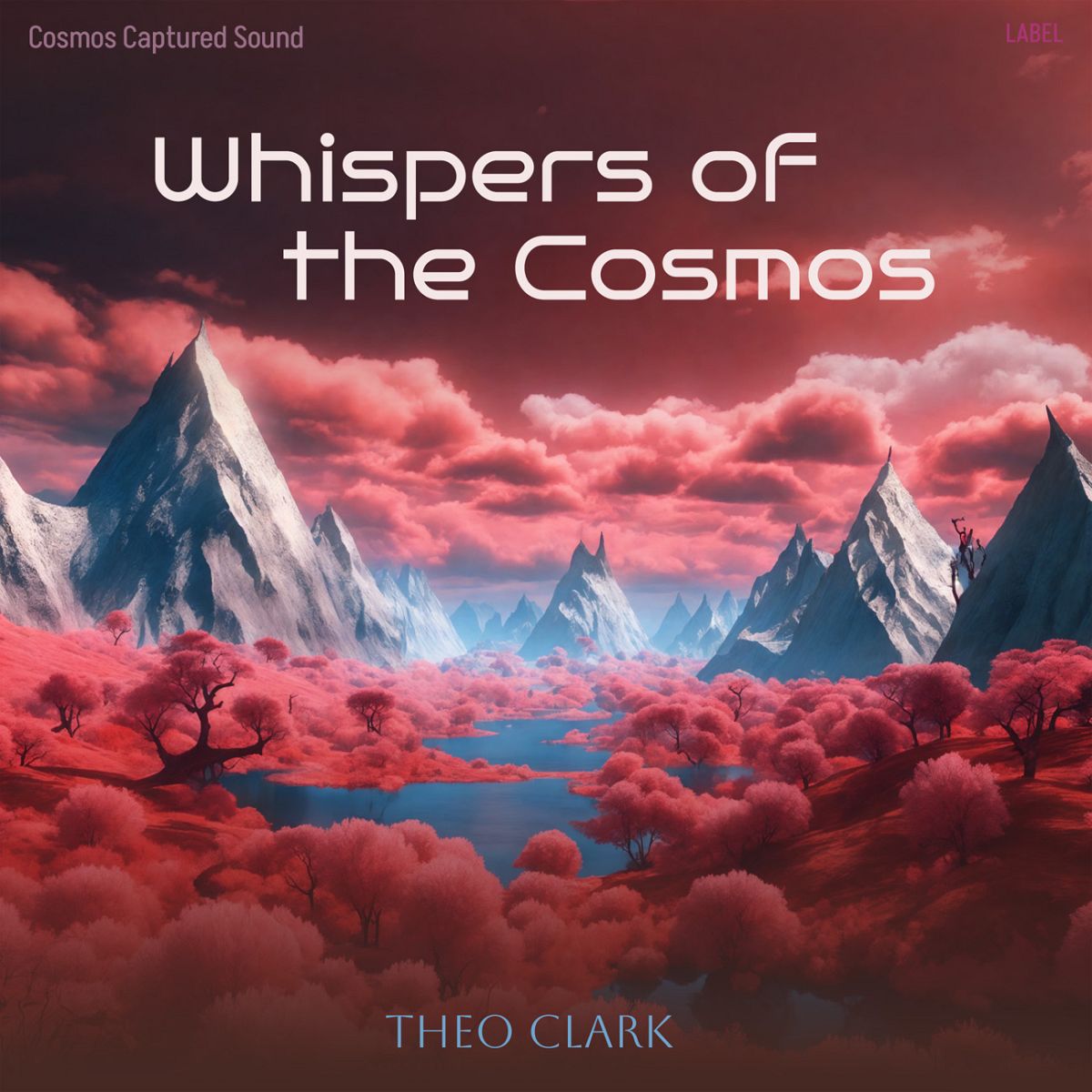 Tags: mountains, pink trees, river, fantasy, cover art, clouds, album, landscape, cosmos, whispers, futuristic, surreal, dreamy, sunset, vibrant, serenity, sky, snow peaks, otherworldly, peaceful