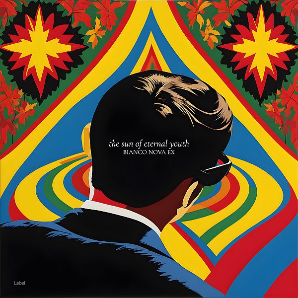 “A man with slicked-back hair faces a vibrant, kaleidoscopic background with star and leaf patterns in red, yellow, blue, and green.”