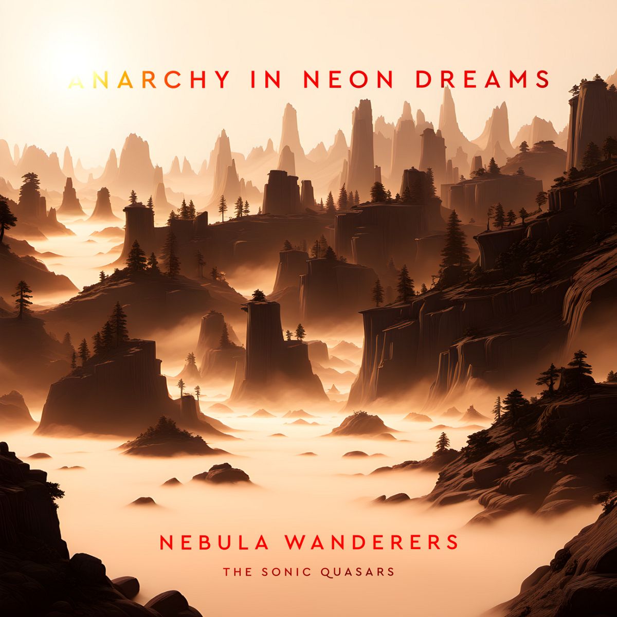 Tags: landscape, fog, mountains, silhouettes, trees, valley, mist, sunset, horizon, cliffs, warm tones, scenery, atmospheric, wilderness, digital art, serene, dreamlike, vast, tranquil, peaks