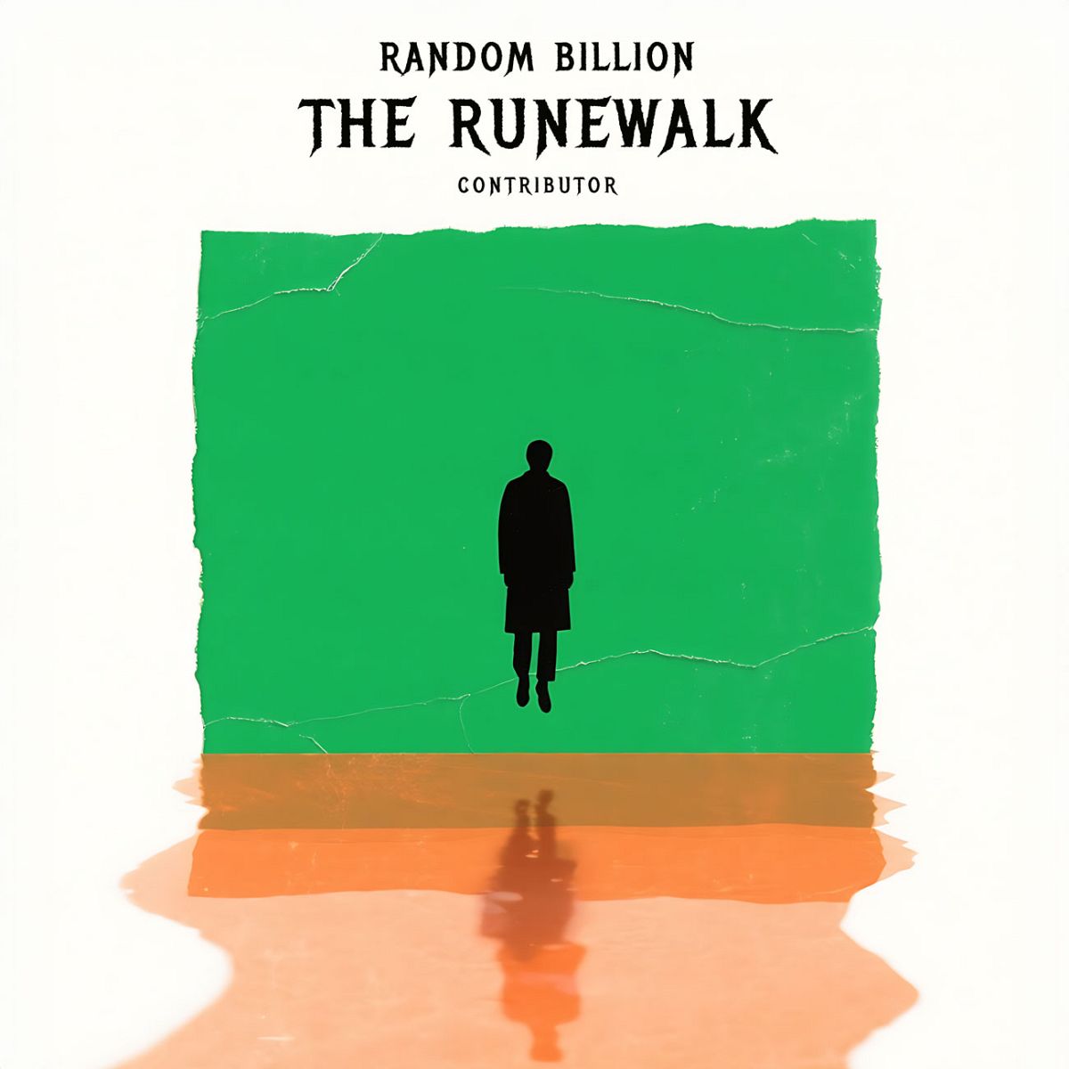 “Silhouette of a person walking with a green background and orange reflection below. Minimalist design.”