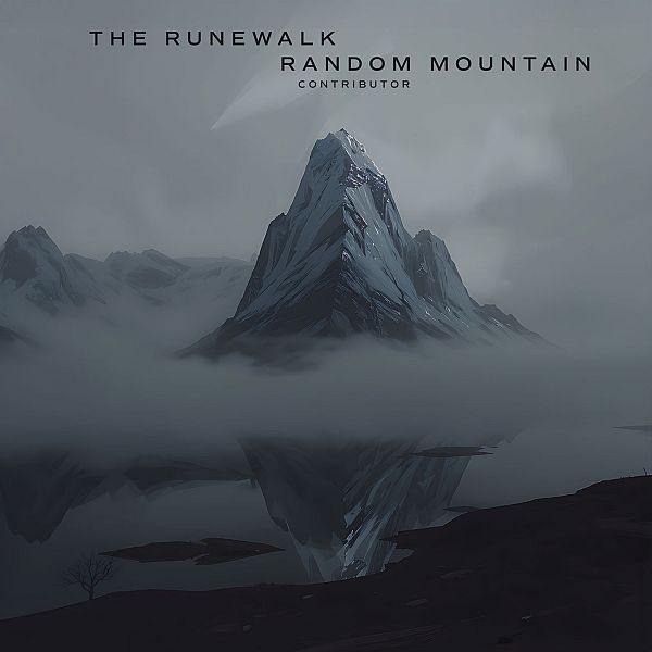 “A solitary, jagged mountain peak rising above a foggy and dark landscape, reflected in a still body of water.”