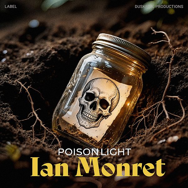 “A glass jar with a skull drawing inside, placed on soil with a few roots around it.”