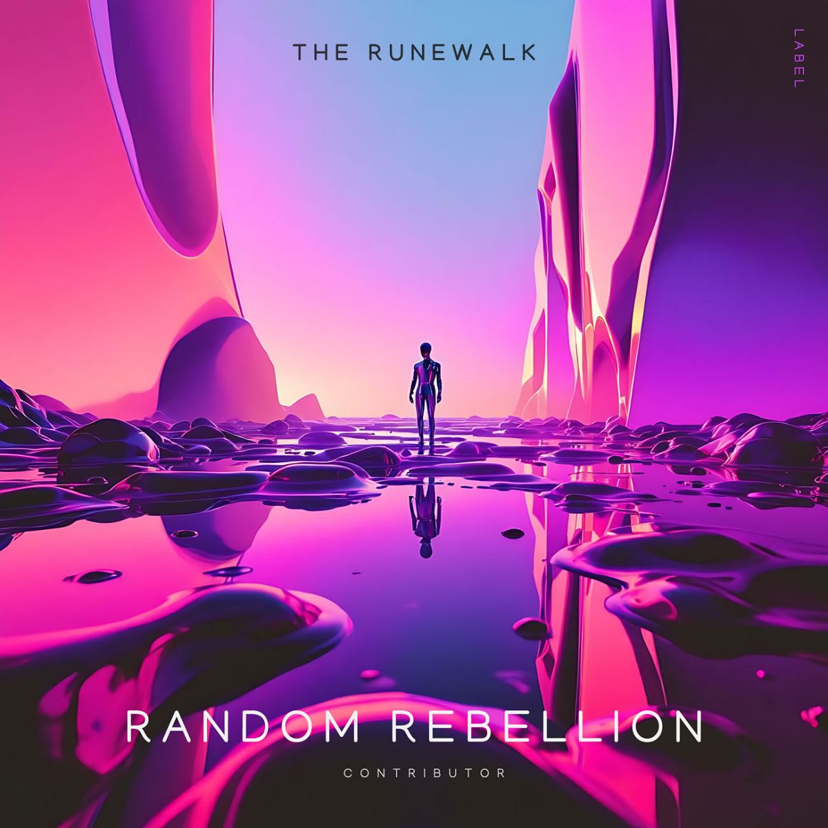 “A person stands in a surreal, colorful landscape with abstract, towering structures and a reflective surface.”