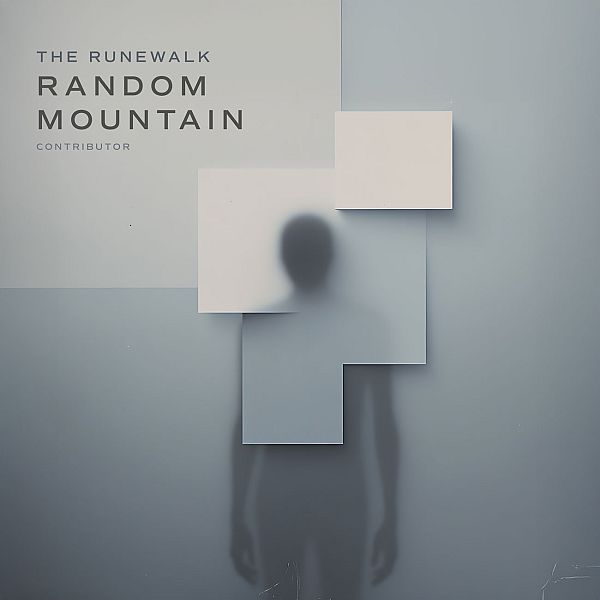 “A blurry silhouette stands against a minimalist geometric background in shades of blue and white.”