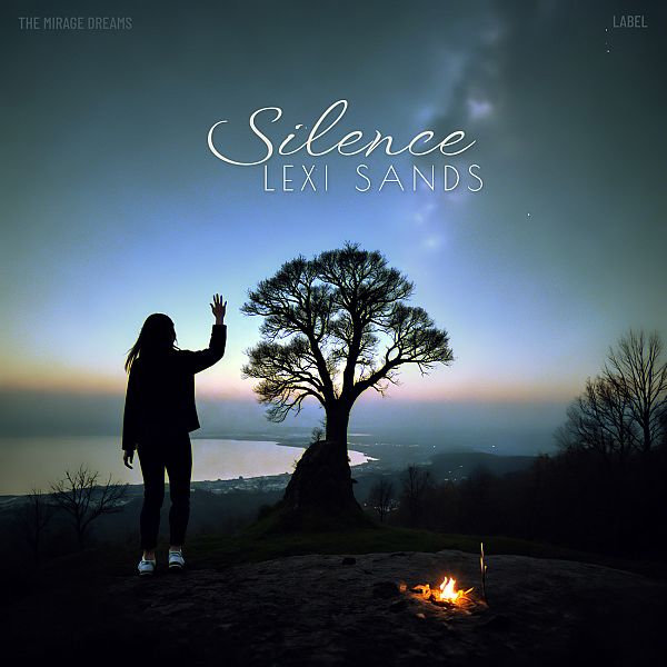 “Silhouette of person near campfire and tree, with ocean and twilight sky in background. Calm and serene atmosphere.”