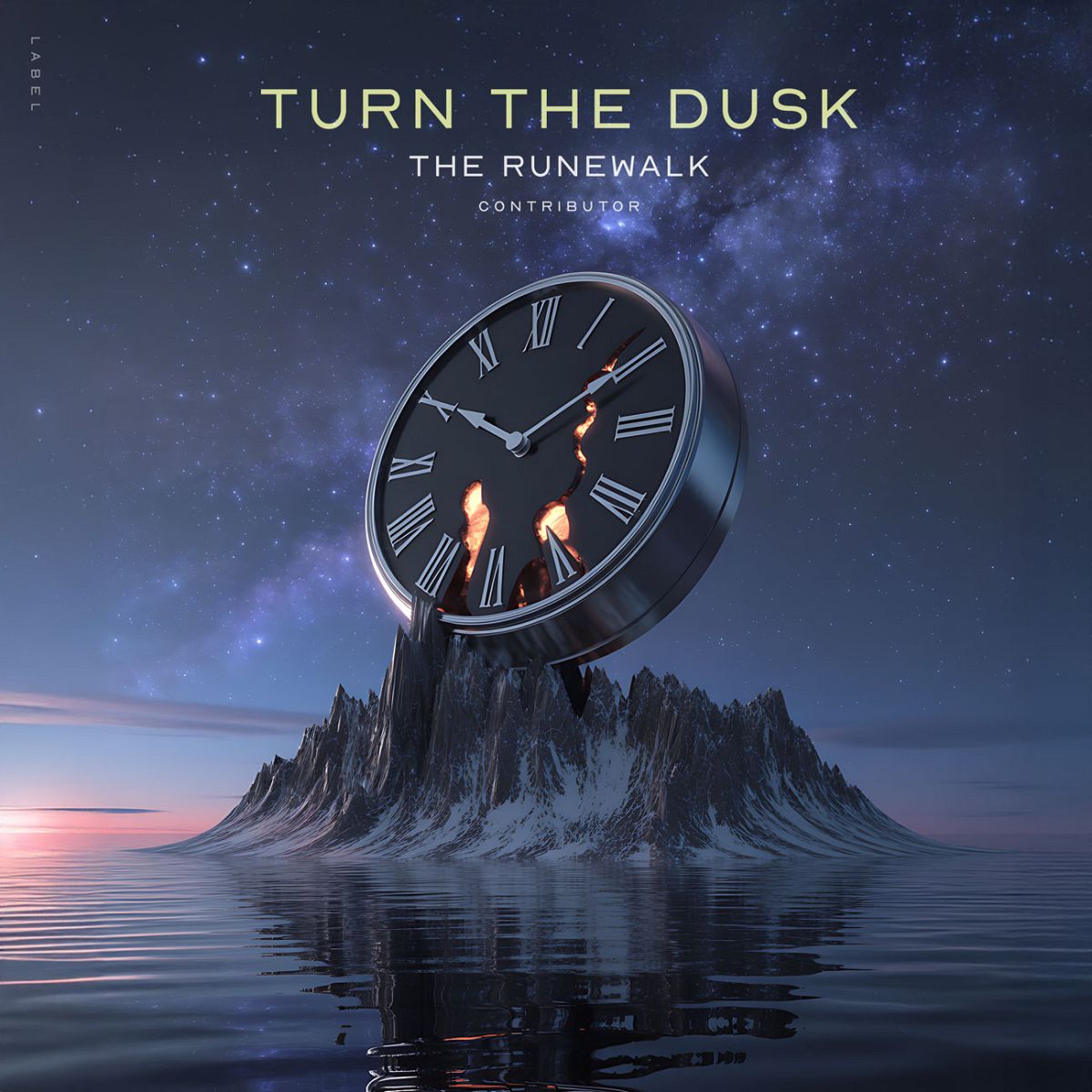 “A floating clock with Roman numerals hovers over a mountain surrounded by water, under a twilight sky.”