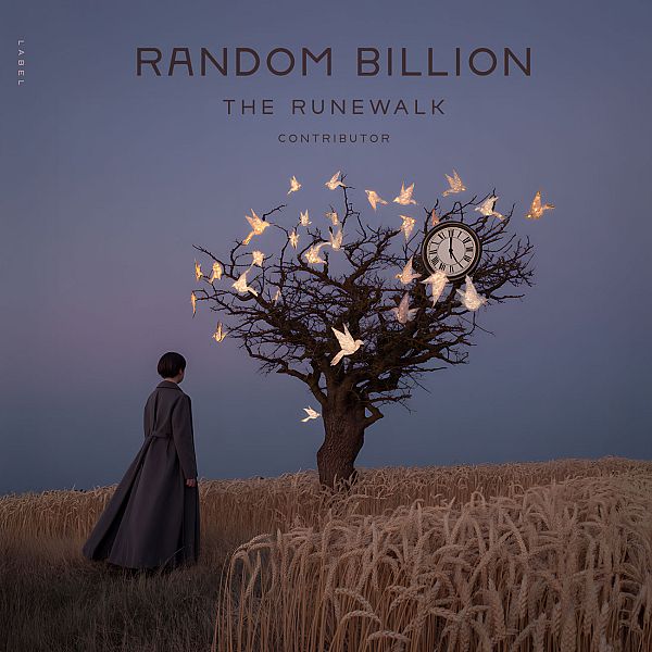 “A person stands in a field beneath a tree covered in clocks and glowing triangles against a dusky sky.”