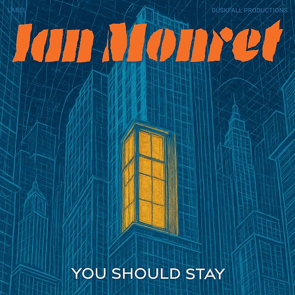 “A stylized skyscraper scene with one lit window at night against a dark, detailed cityscape background.”