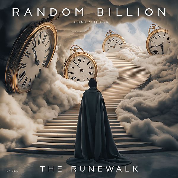 “A cloaked figure ascends a staircase through clouds, surrounded by large vintage clocks.”