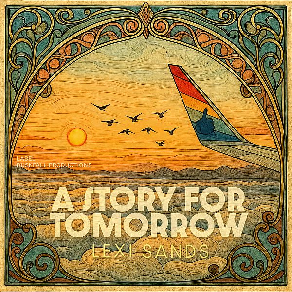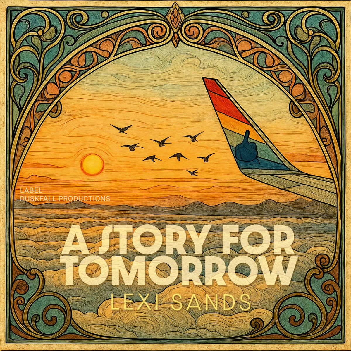 “An ornate design features an airplane tail above clouds at sunset, with birds flying in the distance.”