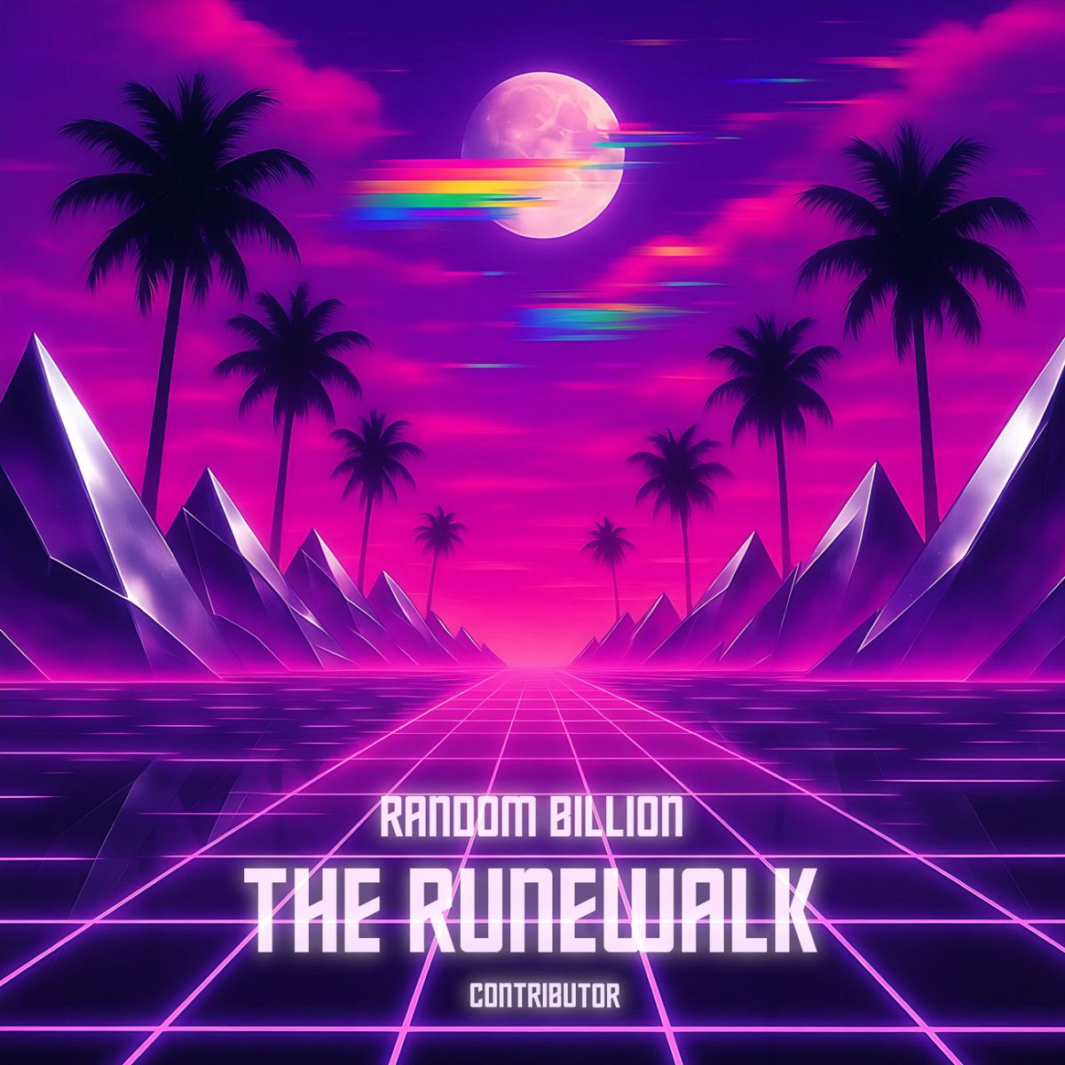 “A retro-futuristic landscape with neon grid, palm trees, mountains, and a large moon in a vibrant purple and pink sky.”