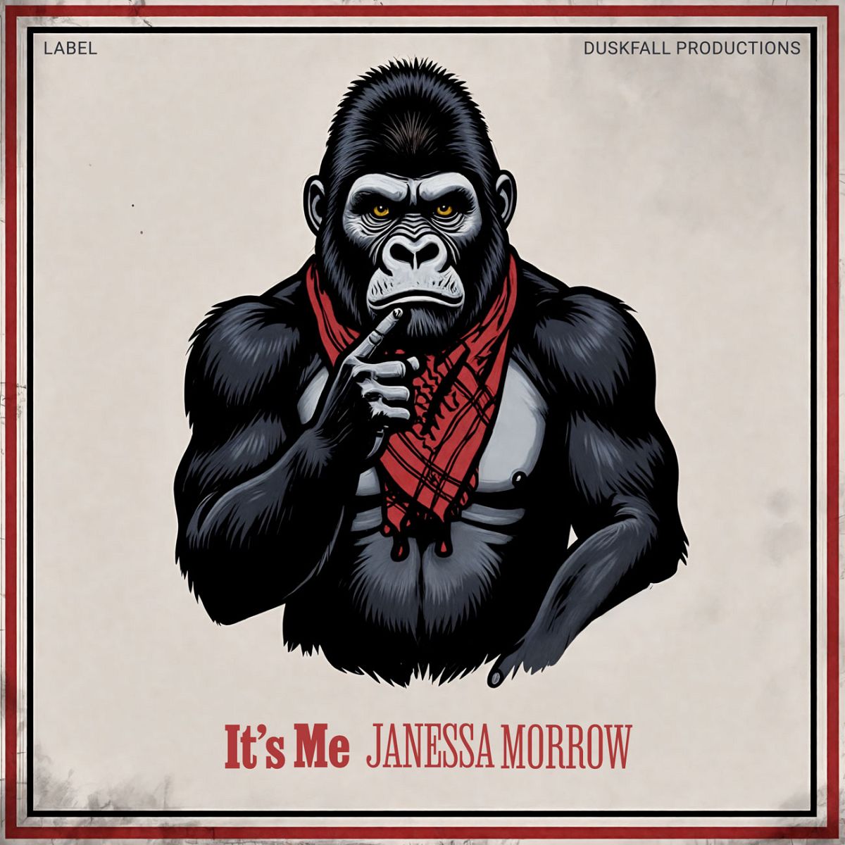 The most popular tags describing this Indie & Folk Music premade album cover are illustration, bold, animal, powerful, mysterious, and other keywords relevant to this premade cover are wild, moody, intense, gorilla, strength, jungle, focus, graphic art, bandana, music cover, design., dark tones, ape.