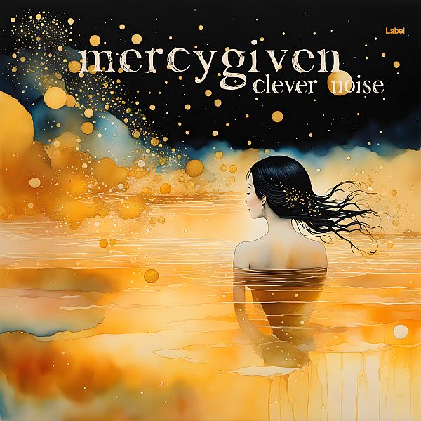 “A woman with flowing hair is immersed in a surreal, golden water setting with a starry sky.”