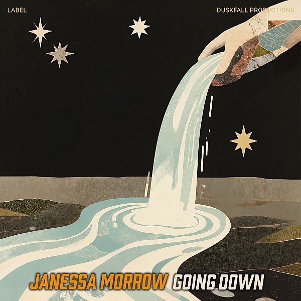 “A surreal design with stars, a hand pouring water, creating a flowing river under a night sky.”